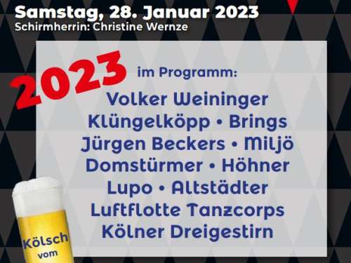 Am Samstag, 28 Januar (Beginn: 16 Uhr, Einlass: 15 Uhr) wird in der traditionsreichen, aber mit modernster Luft- und Viren-Filtertechnik ausgestatteten Stadthalle Köln-Mülheim unter der Schirmherrschaft von Christine Wernze gesungen, geschunkelt, gebützt und gelacht.