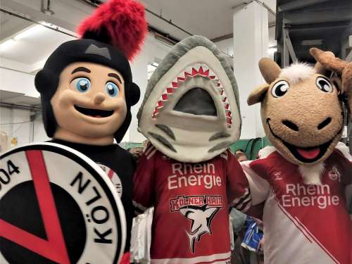 Neben Sharky und Hennes traf Viktor auch auf weitere Maskottchen wie den Bau-Biber, Mixer (beide KVB) oder den Drachen ‚Siggi‘ (VRS). Zu Beginn der Veranstaltung marschierten die Maskottchen gemeinsam mit den Tanzgruppen eine Runde um die Menschenmenge. Während des Programms feierten sie gemeinsam mit den Kindern in der LANXESS-Arena und waren ein beliebtes Motiv für Selfies.