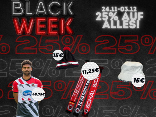 Ab sofort läuft die Black Week bei Viktoria Köln! Da das BLACK Teil unserer Vereinsfarben ist, haben wir in diesem Jahr wieder eine ganz besondere Aktion für Euch: Im Onlineshop erhaltet ihr 25% Rabatt auf alle Produkte, zudem bekommt Ihr die Tickets für zwei Heimspiele geschenkt.